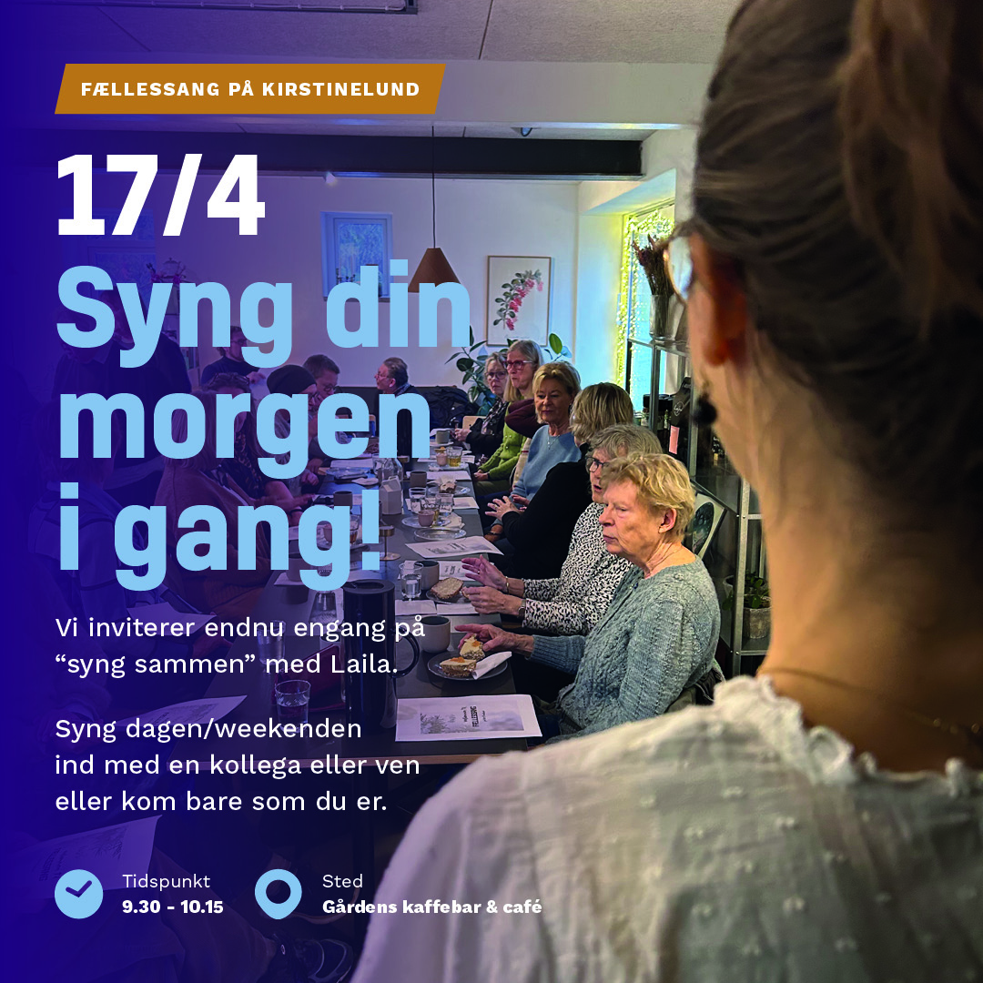 Kom og syng din morgen i gang. Vær med, når vi synger fredagen i gang i Gårdens kaffebar & café fredag den 17. april. Tag din ven eller kollega med, arrangementet er åbent for alle både her fra gården og i lokalområdet. Fællessang forbinder os på tværs af alder, livserfaring og stemmeleje. Når vi synger sammen, kommer både åndedræt, lattermuskler og ører i spil og du går videre ud i dagen med lethed, varme og måske en melodi på læben. Laila, som i mange år har været vært for fællessang flere steder, leder os med nærvær og glæde. Hun er uddannet musiklærer og arbejder i dag som korleder og kropsterapeut så du er i trygge, hjertevarme og musikalske hænder. Vi synger kl. 9.30 – 10.15 Du kan komme fra kl. 9.15, og vi slutter senest kl. 10.30. Hele rammen byder på vand, filterkaffe, snak og masser af hyggeligt samvær. Pris: 55 kr. pr. person inkl. vand og filterkaffe – betaling via MobilePay. Hygge & lækkerier: Før og efter sangen kan du købe kaffe, cappuccino, latte m.m. – til en fællessangspris. Der er også et godt tilbud på MIB’s morgenstykker med smør og Gammelknas-ost eller en lækker croissant Kom, som du er, […]